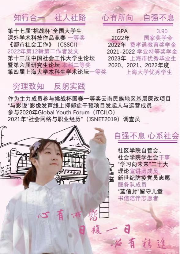 张依芸,2019级社会学专业学生,中共党员,已推免至北京大学,荣获2021-2022年本科生校长奖学金。个人曾获得2020-2021年第十三届中国社会工作大学生论坛暨第六届研究生论坛本科二等奖、2020-2021年第十七届“挑战杯”大学生课外科技与学术作品竞赛全国一等奖、第四届ok138cn太阳集团本科生学术论坛一等奖、2021-2022学年学业优秀特等奖学金、2019-2020和2021-2022学年ok138cn太阳集团优秀学生、2022年度国家奖学金和2022年度费孝通奖学金,并以第二作者在《都市社会工作研究》(CSSCI)2022年第12辑发文。