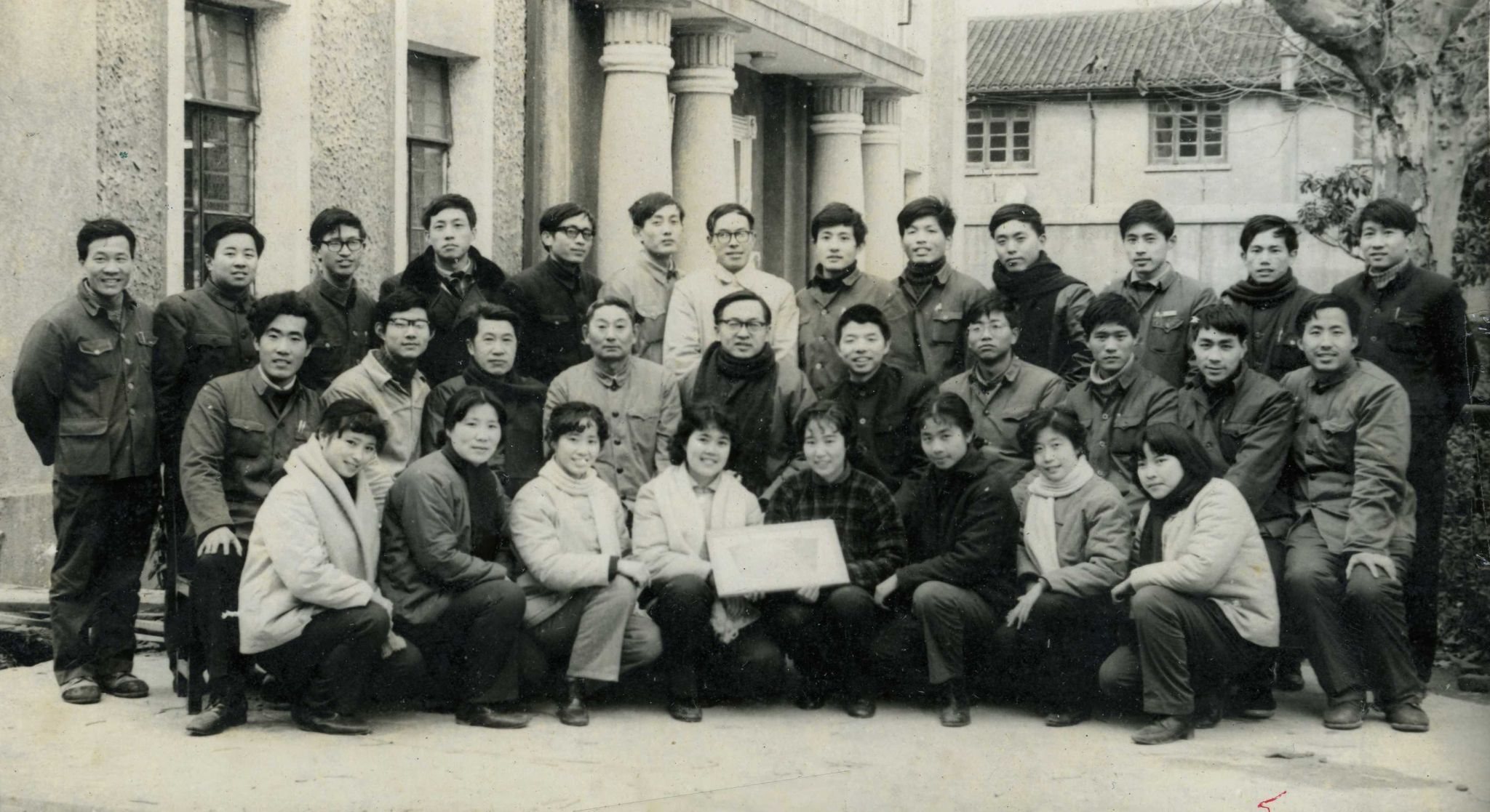 82年春78届毕业生与系主任袁缉辉、总支书记梁树春合影