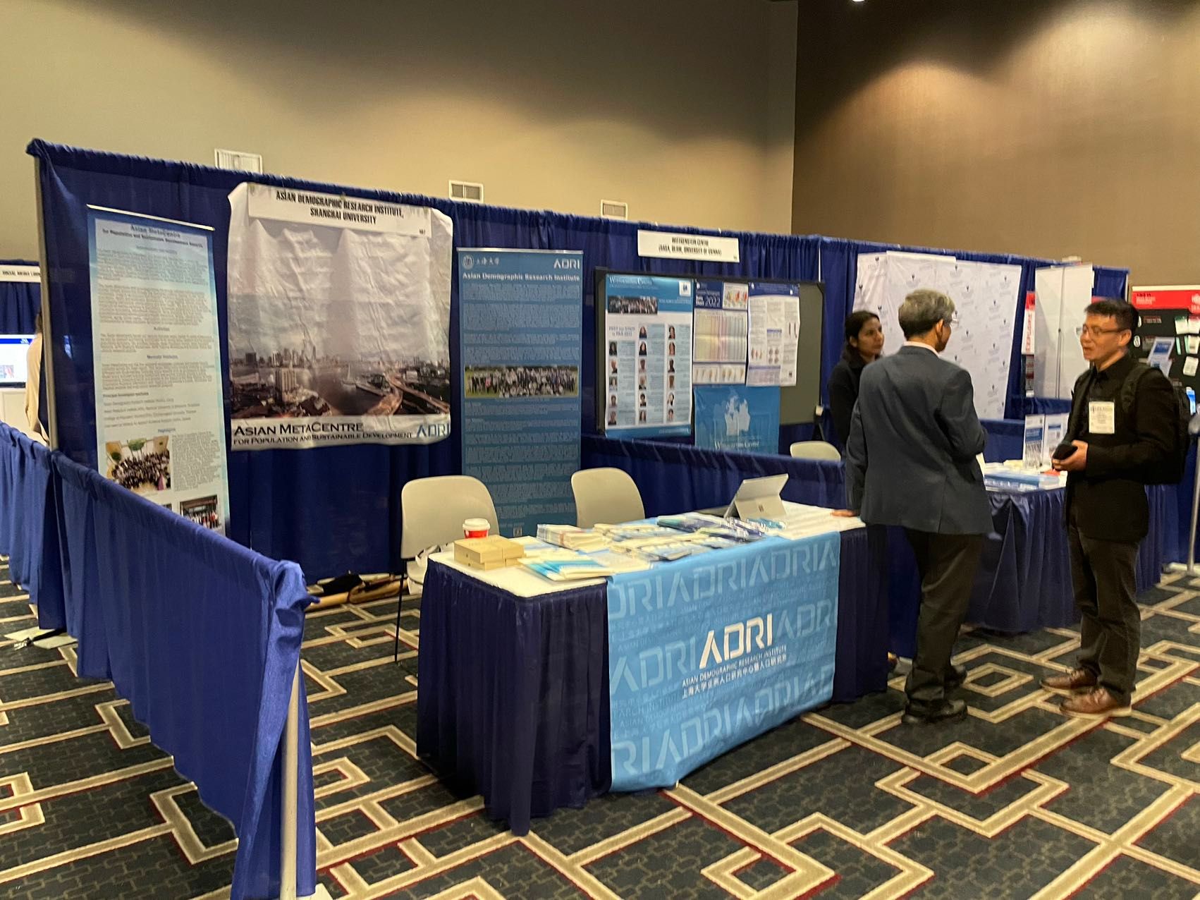 在此次美国人口学会年会上,亚洲人口研究中心还设置了学术展台,向来自全世界的人口学家、研究人员展示中心的学术架构、研究主题、最新学术进展,宣传中心学术论坛和活动等,这也吸引了许多青年研究人员来到展台了解中心的国际研究生项目、交流学者项目等,许多学者还表示有机会非常愿意与亚洲人口研究中心开展学术合作并进行实地访问。同时,作为亚洲人口与可持续发展元中心的总部,中心在展台上也进一步展示了元中心的合作研究、培训、交流平台建设情况。