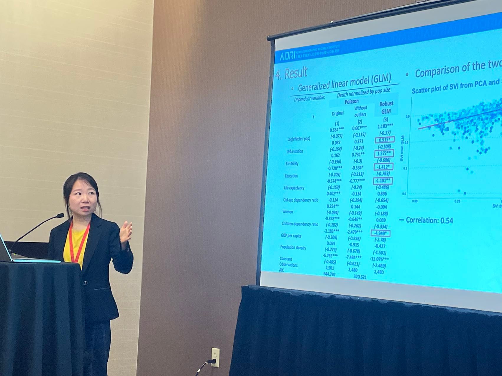 博士生李雪婷在分会场Demographic Research for Climate Change Policies(气候变化政策的人口学研究)展示了其撰写的文章“Measuring Global Social Vulnerability to Natural Hazards at the Subnational Level(衡量全球次国家级层面自然灾害风险下的社会脆弱性)”并发表了相关演讲。这篇论文展示了全球次国家级层面自然灾害风险下社会脆弱性的时空分析。基于不同路径下社会脆弱性水平变化的趋势和影响,研究提出了针对实现可持续发展目标应当做出的政策性努力。在讨论阶段,文章收到了来自美国、联合国和欧洲众多专家学者的意见和建议。