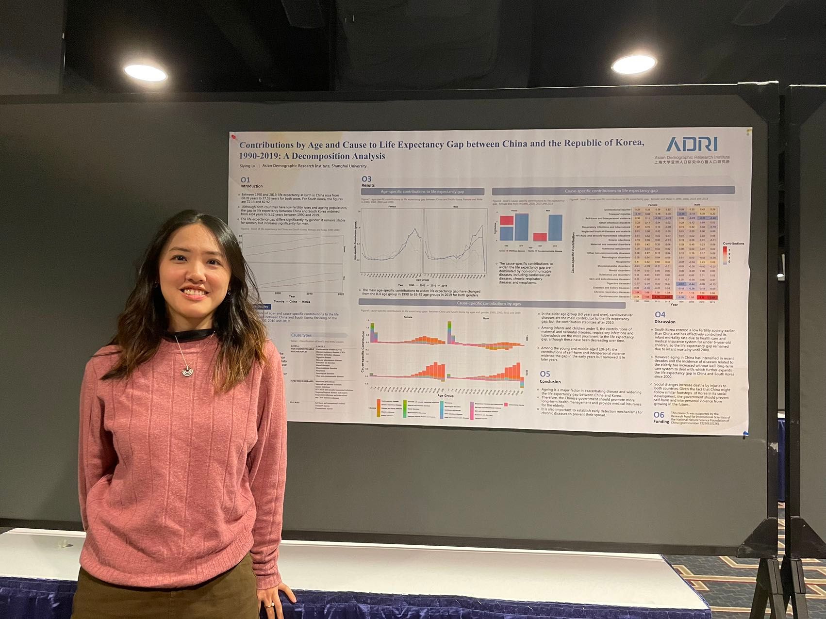 研究生吕思颖参加了海报展示环节,就其研究成果“Age- and Cause-Specific Contributions to Changes in Life Expectancy in China and Republic of Korea Between 1990 and 2019: A Decomposition Analysis(1990-2019年中韩预期寿命差异的年龄别及死因别贡献的拆解)”向与会者介绍了整体研究情况。该研究在老龄化的背景下,阐述了老龄人心血管疾病的死亡对造成中韩两国预期寿命差异的显著贡献。此外,研究探讨了中韩两国医疗保险体系的差异对疾病监控的影响。当前亚洲地区人口老龄化备受关注,多位海内外学者针对海报展开了交流,肯定了研究价值。